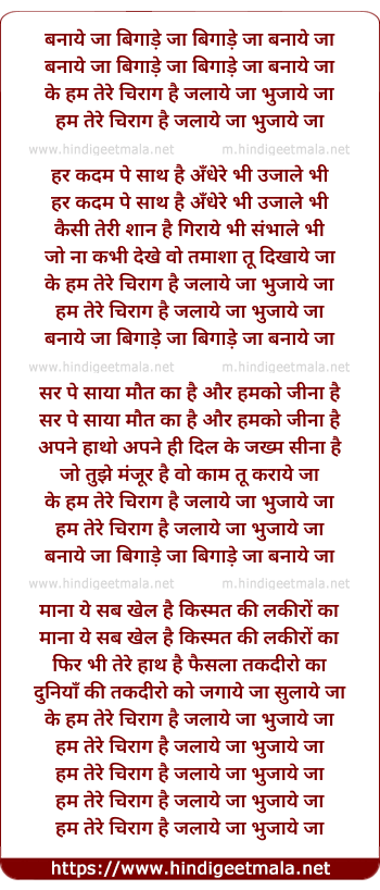 Lyrics of Banaye Ja Bigade Ja Bigade Ja Banaye Ja - बनाये जा बिगाड़े जा बिगाड़े जा बनाये जा