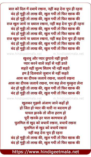 Lyrics of Band Ho Muthhi To Lakh Ki - बंद हो मुठ्ठी तो लाख की
