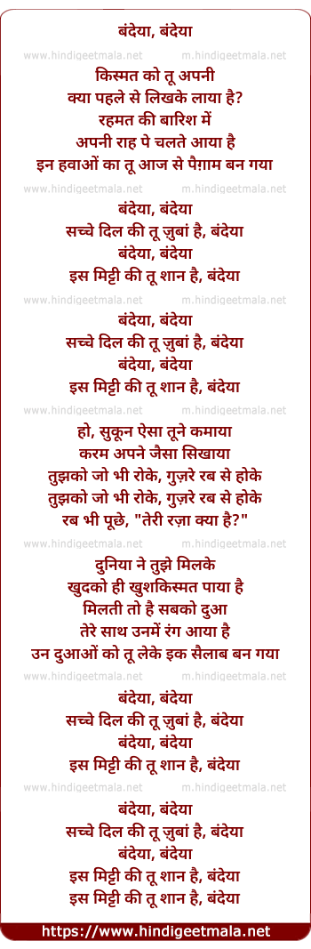 Lyrics of Bandeya Sachche Dil Ki Tu Zubaan Hai Bandeya - बंदेया सच्चे दिल की तू जुबां है बंदेया