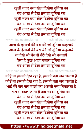 Lyrics of Band Aankh Se Dekh Tamasha Duniya Ka - बंद आंख से देख तमाशा दुनिया का