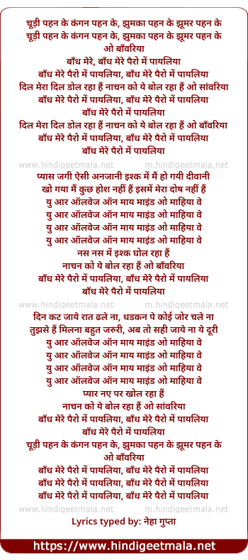 Lyrics of Bandh Mere Pairo Me Payaliya - बाँध मेरे पैरो में पायलिया