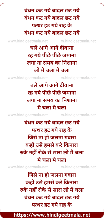 Lyrics of Bandhan Kat Gaye Badal Chat Gaye - बंधन कट गये बादल छट गये
