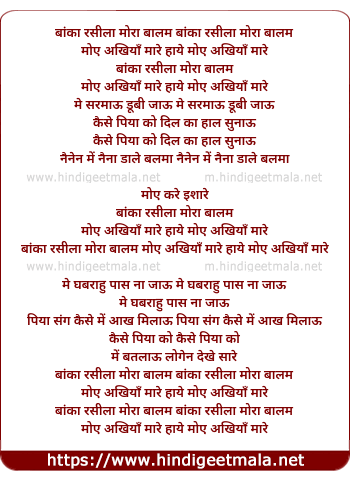 Lyrics of Banka Rasila Mora Balam - बांका रसीला मोरा बालम