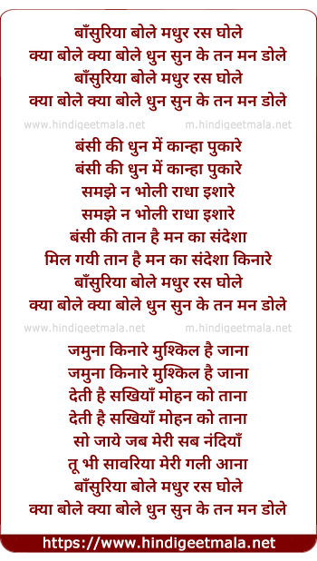 Lyrics of Bansuriya Bole Madhur Ras Ghole Kya Bole Kya Bole - बाँसुरिया बोले मधुर रस घोले क्या बोले क्या बोले