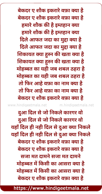 Lyrics of Baqadr E Shauq Iqaraar E Vafaa Kyaa - बेकदर ए शौक इकरारे वफ़ा क्या