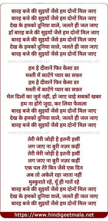 Lyrics of Barah Baje Kee Suiyo Jaise Ham Dono Mil Jaye - बारह बजे की सुइयों जैसे हम दोनों मिल जाए