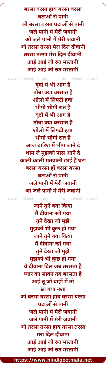 Lyrics of Barsa Barsa Ghatao Se Pani - बरसा बरसा हाय बरसा बरसा