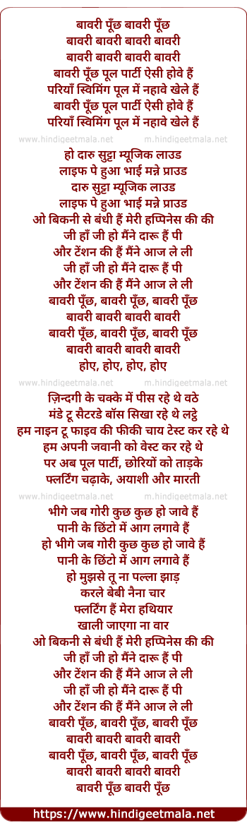 Lyrics of Bawri Pooch Pool Party - बावरी पूँछ पुल पार्टी