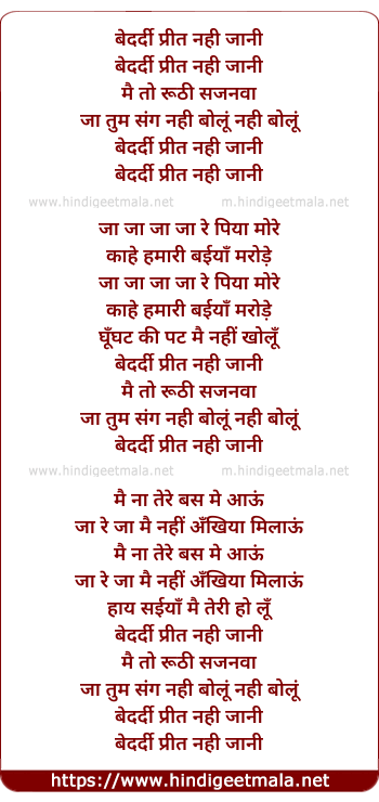 Lyrics of Bedardi Preet Nahi Jaani - बेदर्दी प्रीत नही जानी