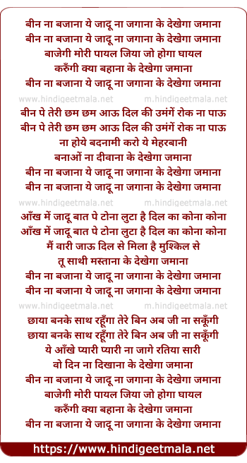 Lyrics of Been Na Bajana Ye Jadu Na Jagana - बीन ना बजाना ये जादू ना जगाना
