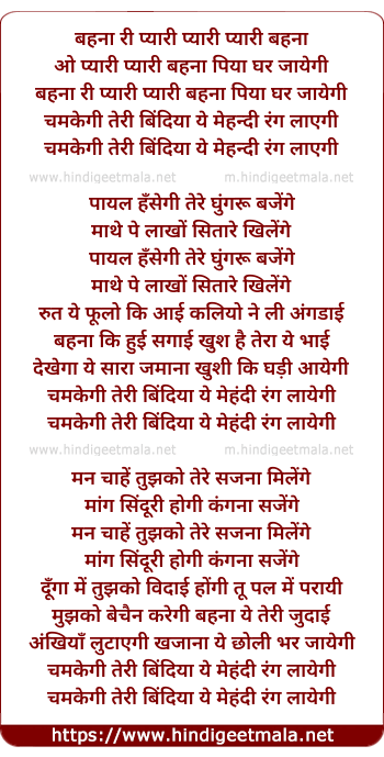 Lyrics of Behna Ri Pyari Pyari - बहना री प्यारी प्यारी