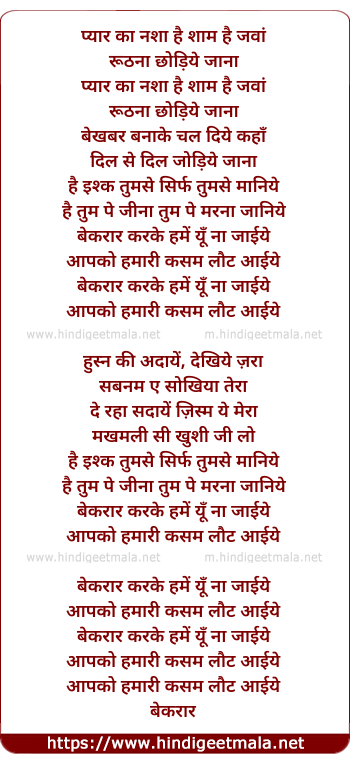 Lyrics of Bekarar - प्यार का नशा है शाम है जवां