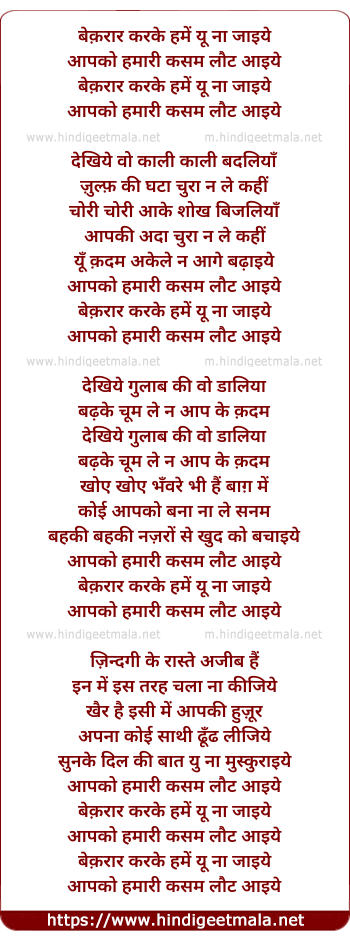 Lyrics of Beqaraar Karake Hamen Yun Na Jaaiye - बेक़रार करके हमें यू ना जाइये