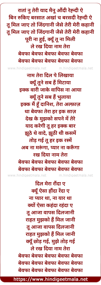 Lyrics of Bewafa (Heartless) - रातां नु तेरी याद मैनू औंदी रेह्न्दी ऐ