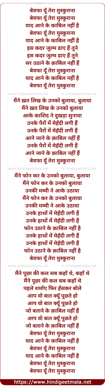 Lyrics of Bewafa Yu Tera Muskurana - बेवफा यूँ तेरा मुस्कुराना