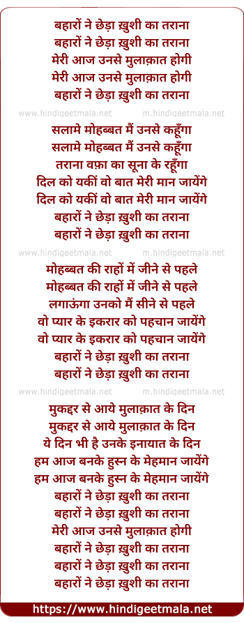 Lyrics of Bahaaro Ne Chheda Khushi Ka Taraana - बहारों ने छेड़ा ख़ुशी का तराना
