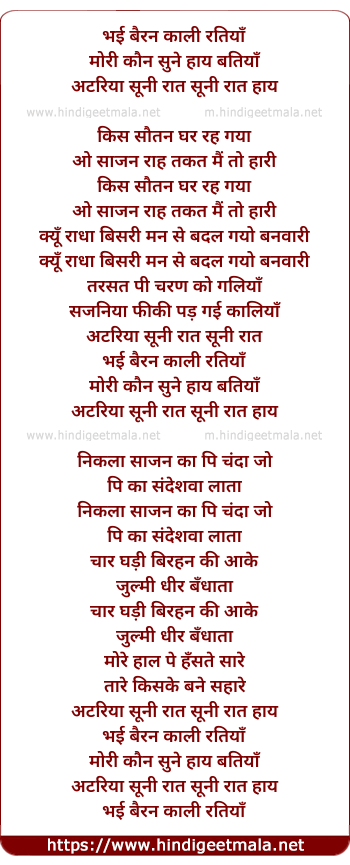 Lyrics of Bhayi Bairan Kali Ratiya - भई बैरन काली रतियाँ