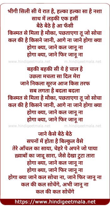 Lyrics of Bhigee Silee See Yeh Rat Hai - भीगी सिली सी ये रात है