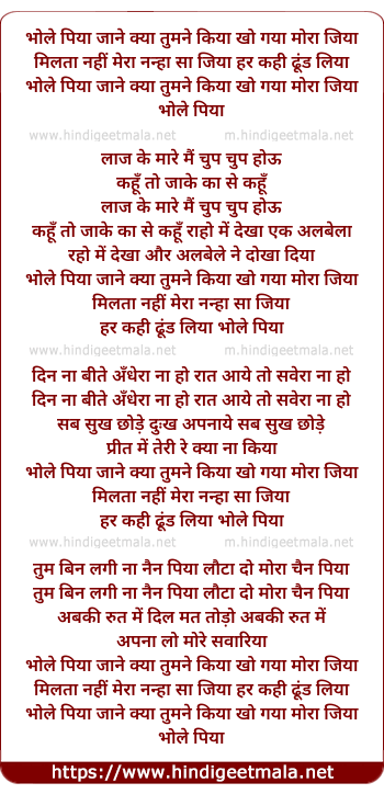 Lyrics of Bhole Piya Jane Kya Tumne Kiya - भोले पिया जाने क्या तुमने किया