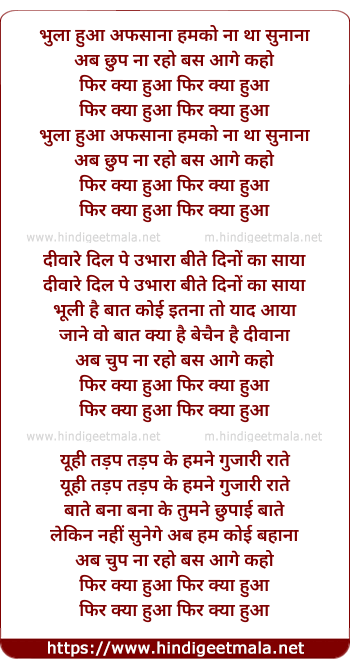 Lyrics of Bhoola Hua Afsana, Humko Na Tha Sunana, Ab Chup Na Raho - भुला हुआ अफसाना, हमको ना था सुनाना, अब चुप ना रहो