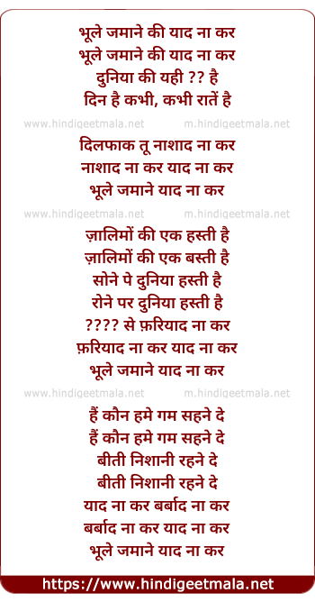 Lyrics of Bhoole Zamane Yaad Na Kar - भूले जमाने याद न कर