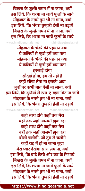 Lyrics of Bikharaa Ke Zulfen Chaman Men Na Jaanaa - बिखरा के ज़ुल्फ़ें चमन में ना जाना, क्यों