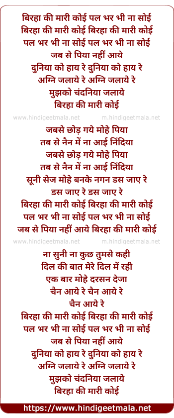 Lyrics of Birahaa Ki Mari Koi - बिरहा की मारी कोई