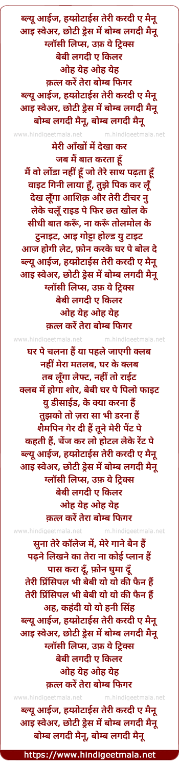 Lyrics of Blue Eyes Hypnotise - ब्ल्यू आईज, हय्प्नोटाईस तेरी करदी ए मैनू