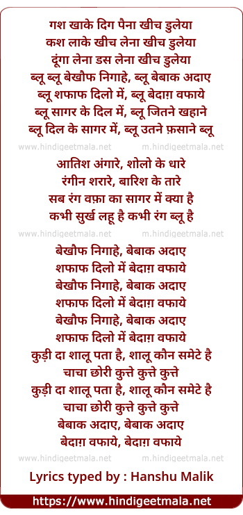 Lyrics of Blue Blue Bekhauf nigaahe - ब्लू ब्लू बेखौफ निगाहें