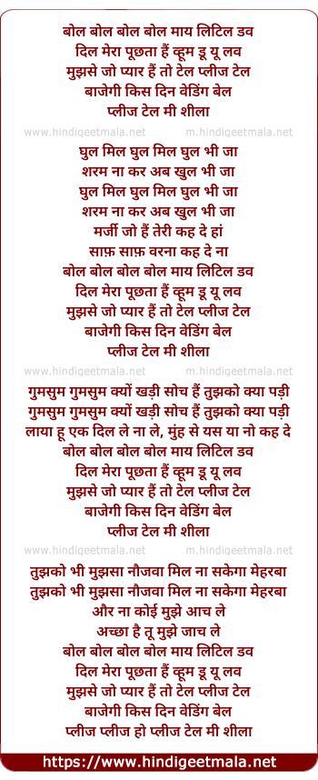 Lyrics of Bol Bol Bol Bol My Little Dove - बोल बोल बोल बोल माय लिटिल डव
