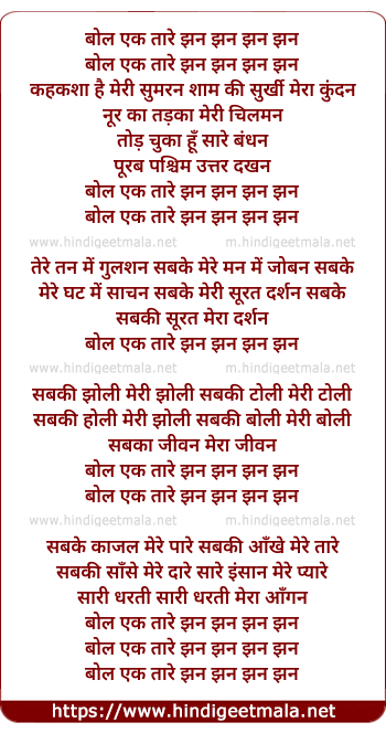 Lyrics of Bol Ik Tare Jhan Jhan - बोल एक तारे झन झन झन झन