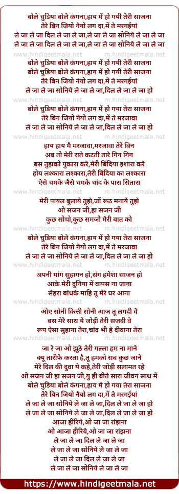 Lyrics of Bole Chudiya Bole Kangna - बोले चुड़िया बोले कंगना
