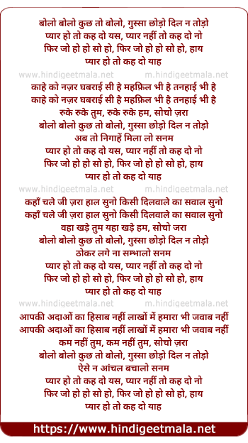 Lyrics of Bolo Bolo Kuchh To Bolo, Gussa Chhodo Dil Na Todo - बोलो बोलो कुछ तो बोलो, गुस्सा छोड़ो दिल न तोड़ो