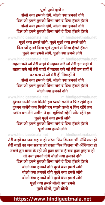 Lyrics of Bolo Kya Hum Ko Doge Dil To Humne Bina Mange De Diya - बोलो क्या हम को दोंगे दिल तो हमने बिना मांगे दे दिया