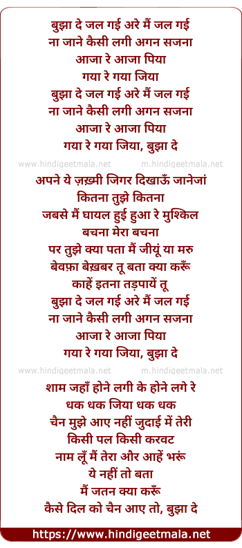 Lyrics of Bujhaa De Jal Gayi - बुझा दे जल गई