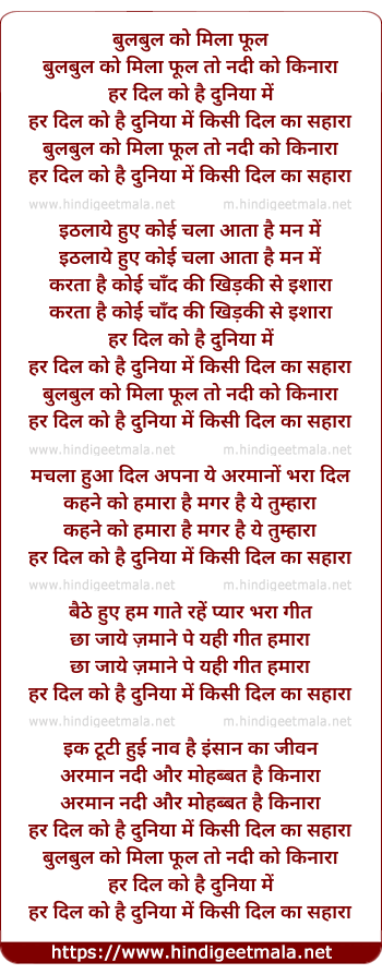 Lyrics of Bulabul Ko Milaa Phul To Nadi Ko Kinaaraa - बुलबुल को मिला फूल