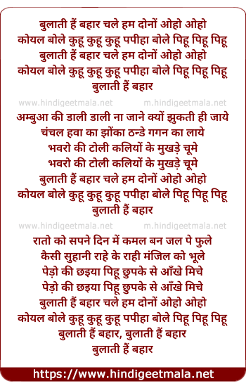 Lyrics of Bulati Hai Bahar Chale Hum Dono Koyal Bole - बुलाती हैं बहार चले हम दोनों ओहो ओहो