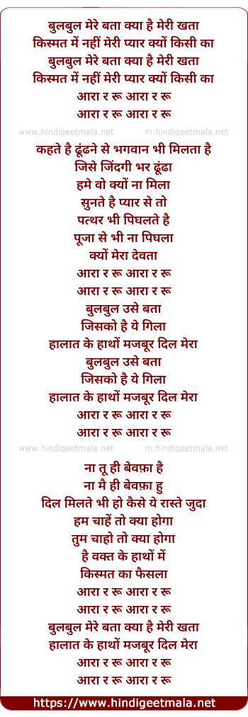 Lyrics of Bulbul Mere Bata Kya Hai Meri Khata - बुलबुल मेरे बता क्या है मेरी खता