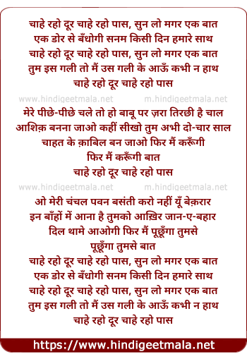 Lyrics of Chahe Raho Dur, Chahe Raho Pas - चाहे रहो दूर चाहे रहो पास, सुन लो मगर एक बात