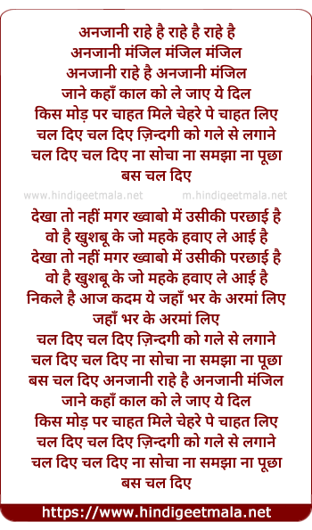Lyrics of Chal Diye Jindagee Ko Gale Se Lagane - अनजानी राहे है राहे है राहे है