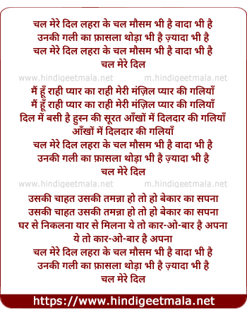 Lyrics of Chal Mere Dil Lahra Ke Chal - चल मेरे दिल लहरा के चल