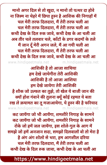 Lyrics of Chal Meree Taraf Dildara - चल मेरी तरफ दिलदारा