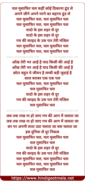 Lyrics of Chal Musafir Chal Kahin Koi Thikana Dhundh Le - चल मुसाफिर चल कहीं कोई ठिकाना ढूंढ ले