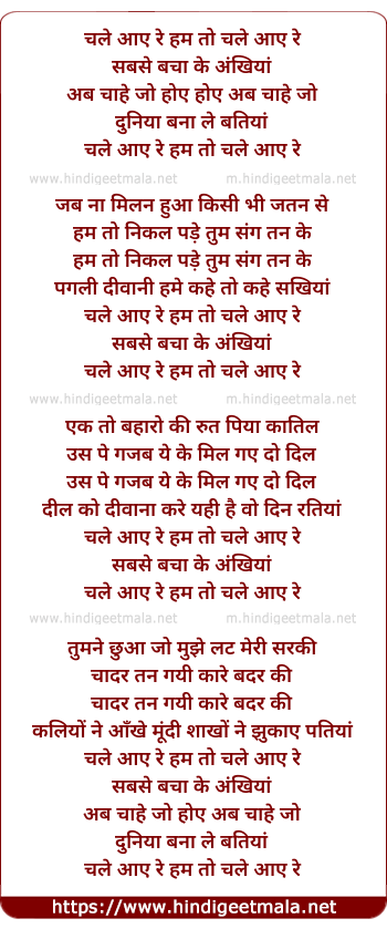 Lyrics of Chale Aaye Re Hum To Chale Aaye Re - चले आए रे हम तो चले आए रे