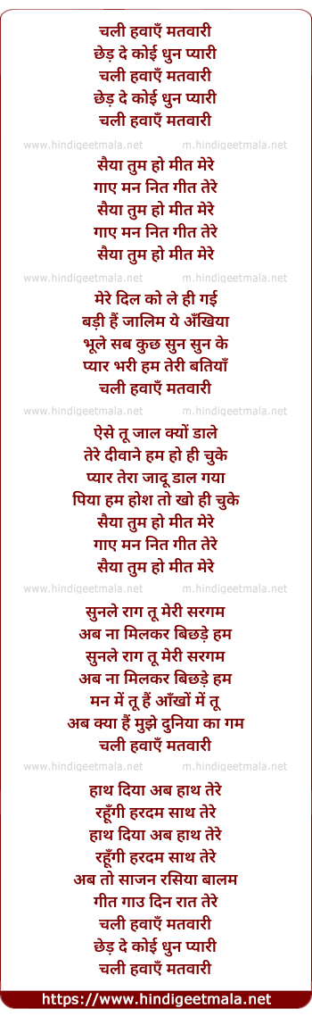 Lyrics of Chali Hawaye Matwari Chedd De Koi Dhun Pyaari - चली हवायें मतवारी छेड़ दे कोई धुन प्यारी