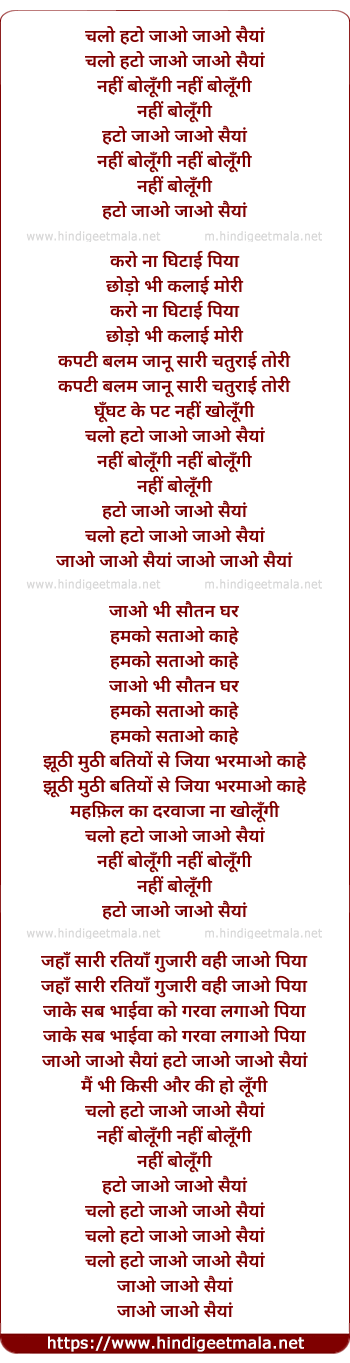 Lyrics of Chalo Hato Jaao Jaao Saiya - चलो हटो जाओ जाओ सैयां