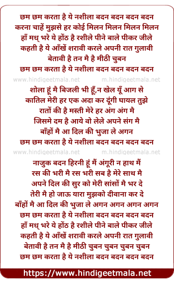 Lyrics of Cham Cham Karta Hai Yeh Nashila Badan - छम छम करता है ये नशीला बदन