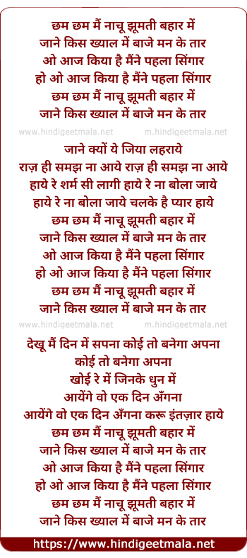 Lyrics of Cham Cham Mai Naachu, Jhumti Bahar Me - छम छम मैं नाचू, झूमती बहार में