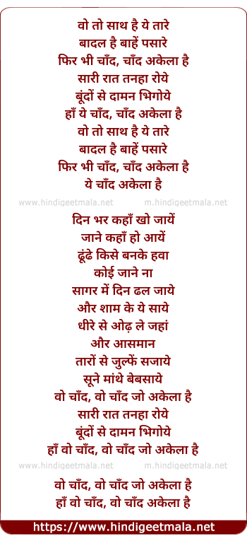 Lyrics of Chand Akela Hai - वो तो साथ है ये तारे