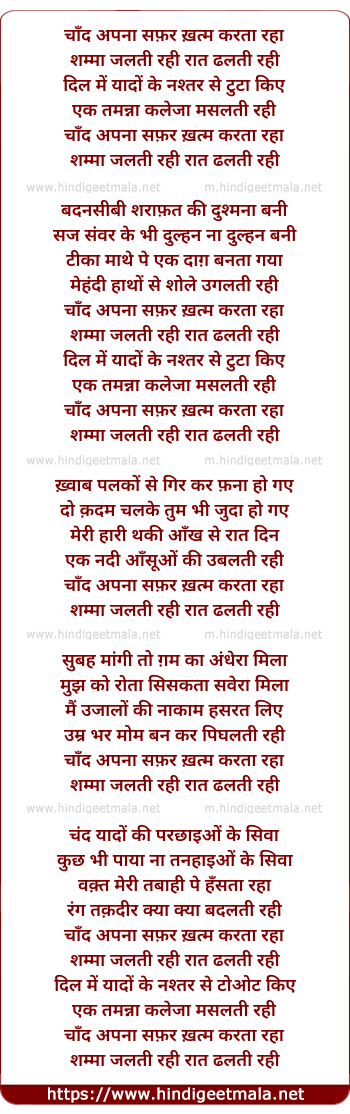 Lyrics of Chand Apna Safar Khatma Karta Raha - चाँद अपना सफ़र ख़त्म करता रहा